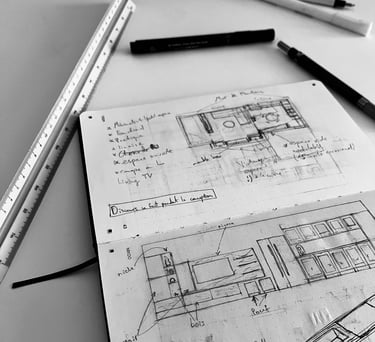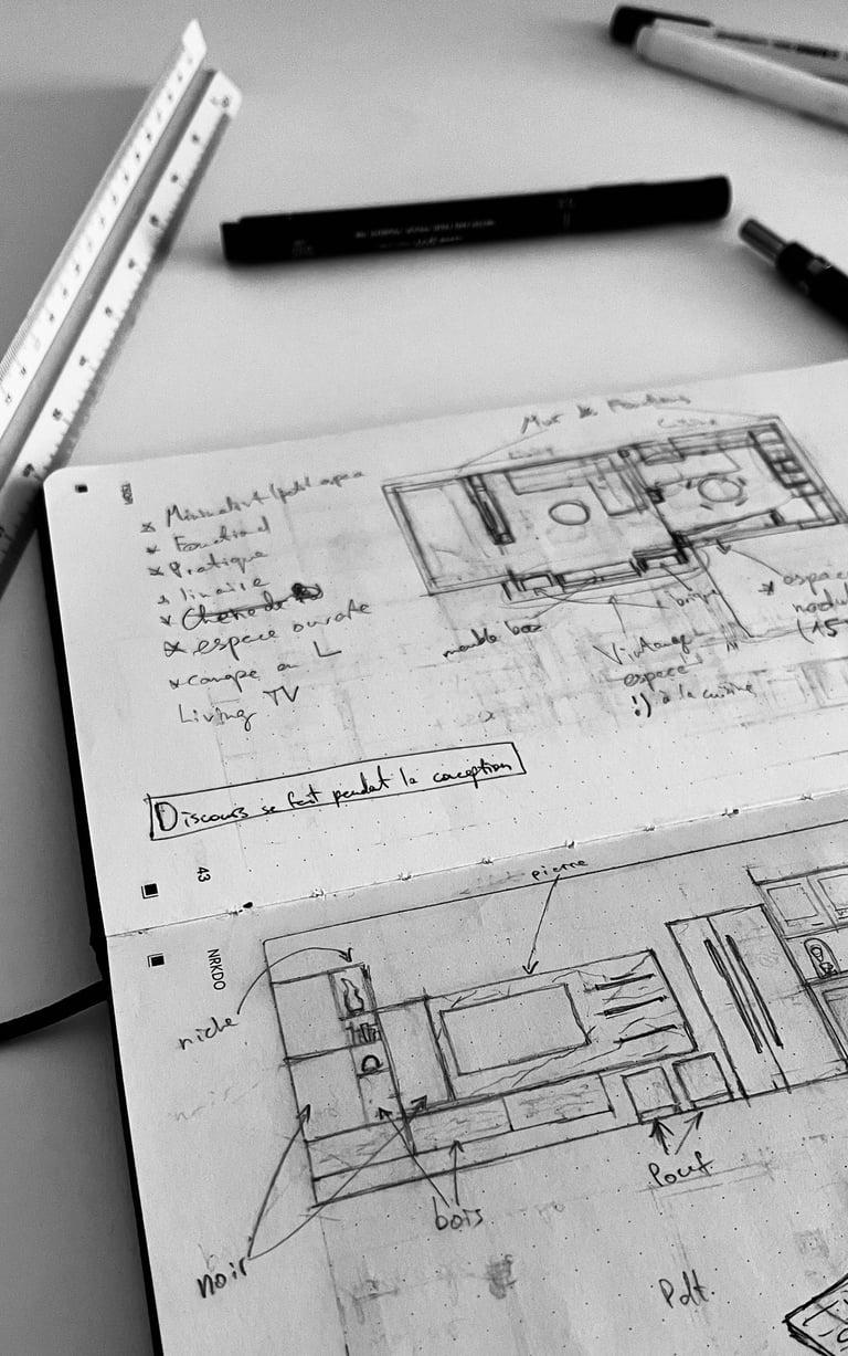 À partir de ces informations, des esquisses préliminaires sont élaborées pour explorer diverses idées et concepts. Pour créer des compositions uniques, progressivement, ces esquisses se transforment en lignes et en formes, en jeux de lumière et de matière, chaque élément orchestrant une harmonie visuelle saisissante.